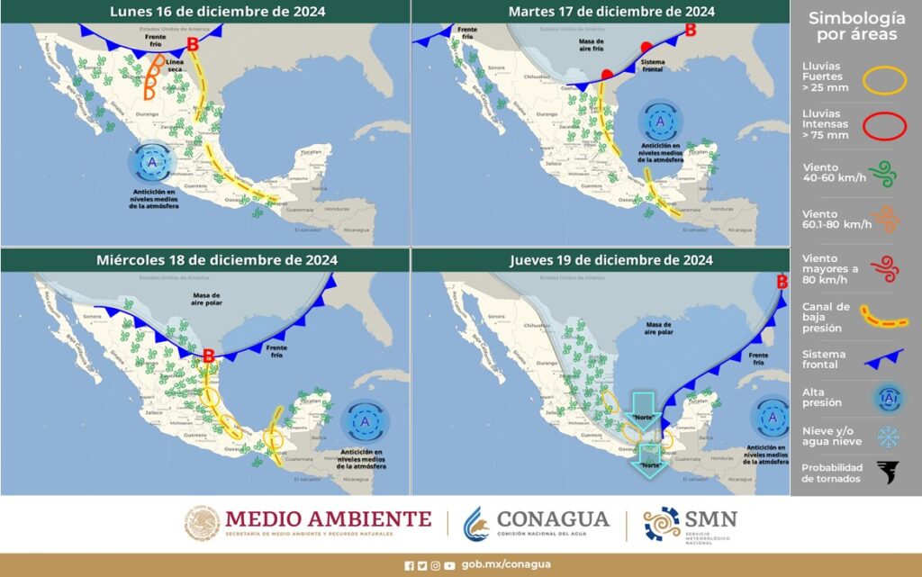 La Dirección General de Protección Civil informó sobre las condiciones climáticas de la semana, con una alerta preventiva vigente por las bajas temperaturas. Se destaca la entrada del frente frío número 15, que interactuará con una línea seca en Chihuahua y un canal de baja presión en el noreste del país. Esta combinación generará vientos fuertes con posibles tolvaneras en dichas regiones.